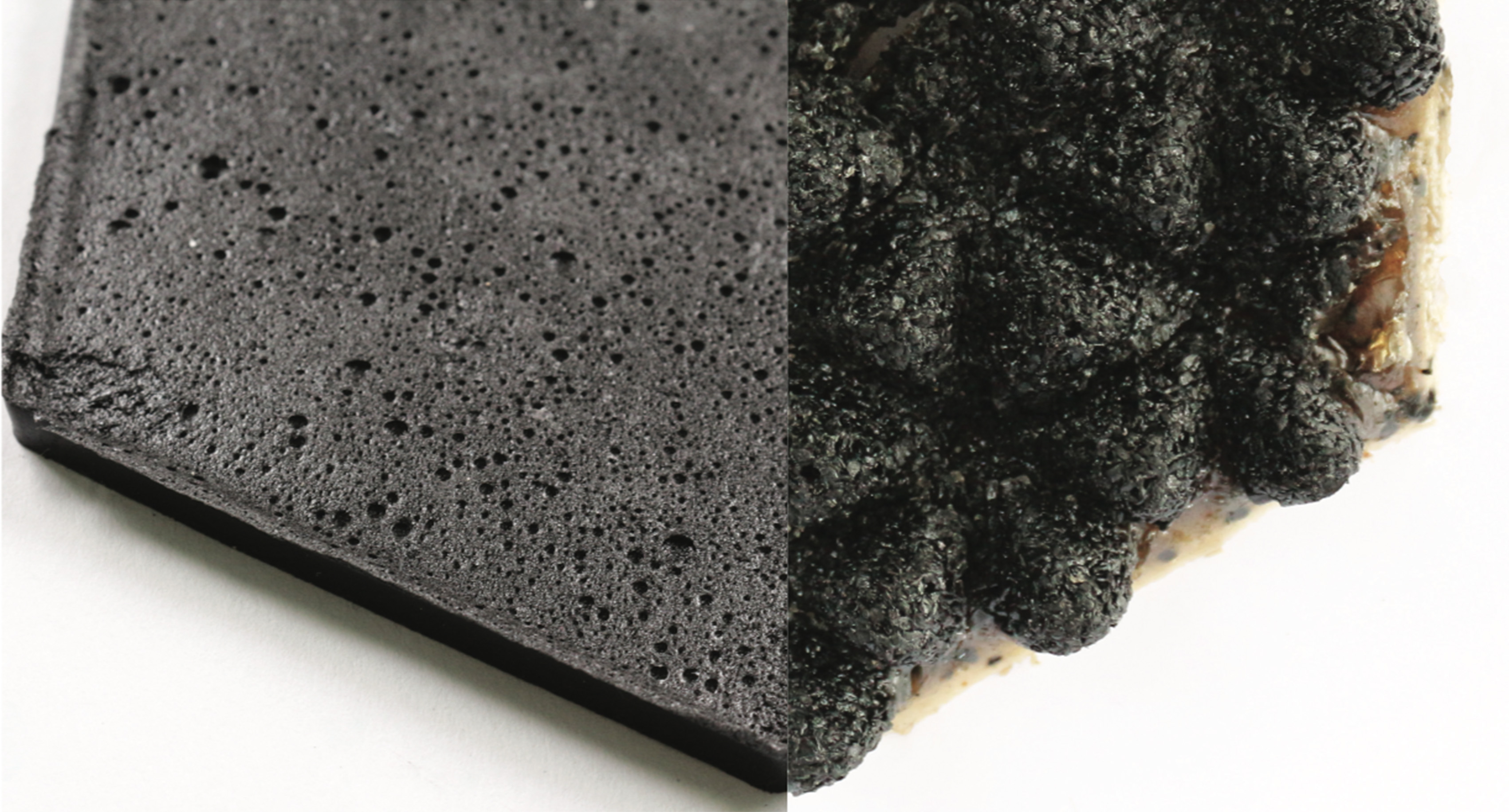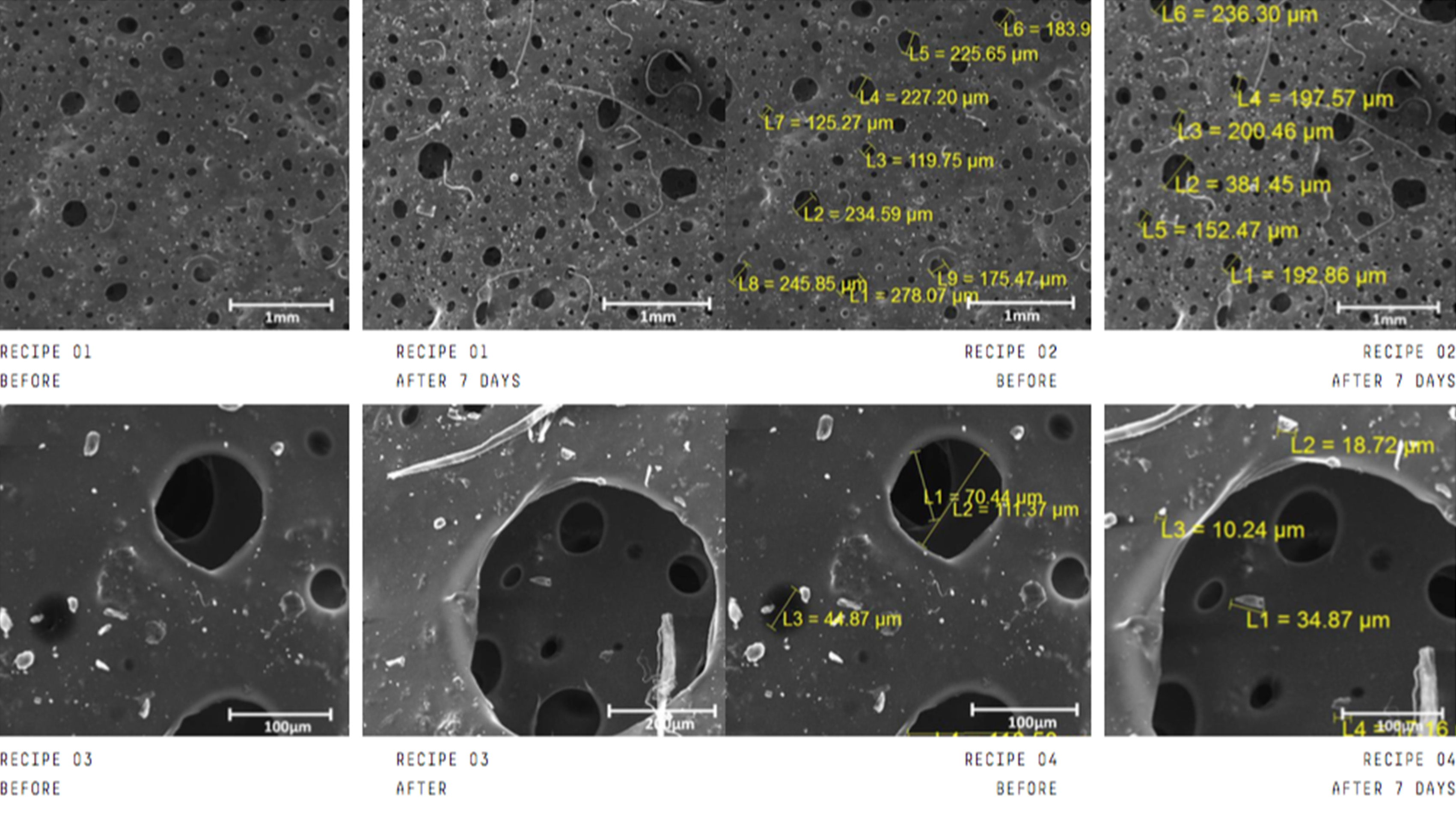 Some samples made for the Restology project were sent to the laboratory to be tested. The scan of electrons viewed in the microscope shows that the best recipe for creating a bio filter is one with the greatest amount of activated charcoal and almost as much glycerol as gelatin for better flexibility. The amount of ingredients use for this recipe is 20% glycerol , 28% gelatin, 57% activated charcoal and 14% water. Compared to the others, this recipe presented the highest average pore-size of 50μm, “creating a set of thin porous walls one behind another with inside cavities allowing the filtration of air pollutants.”**
