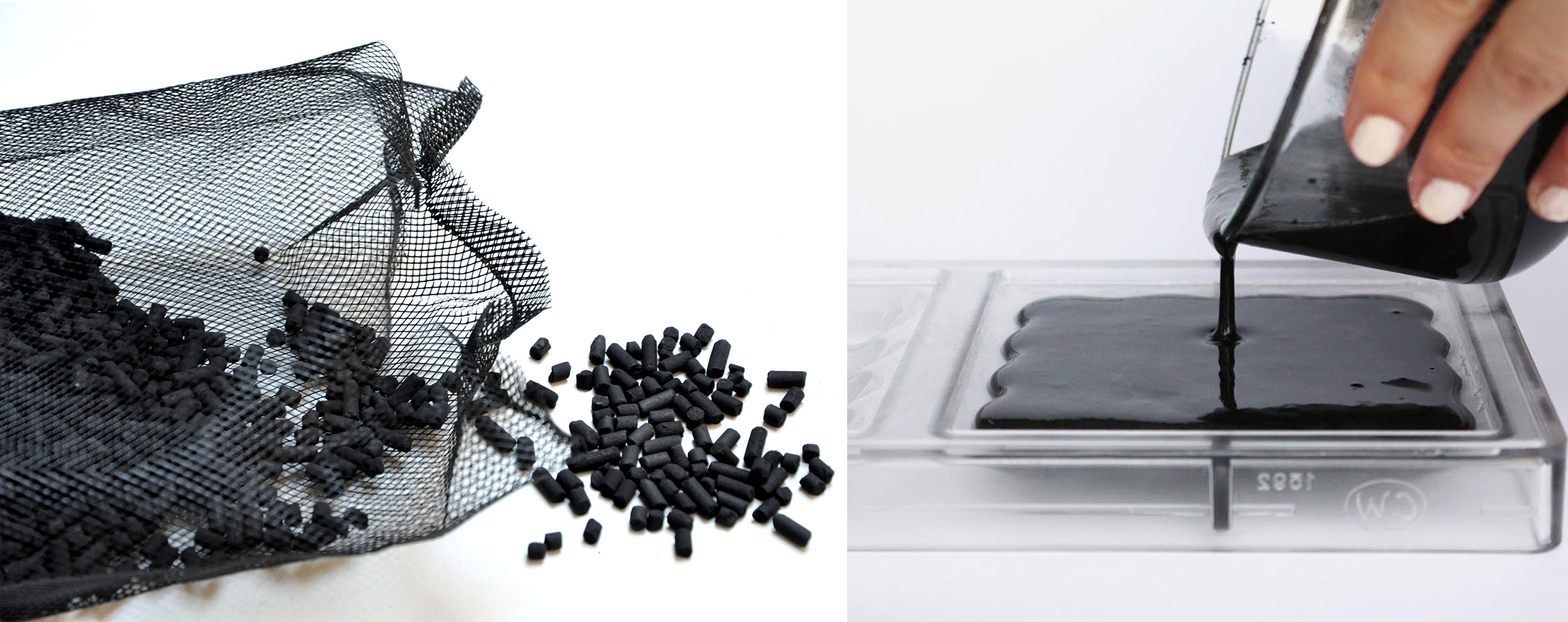 Activated charcoal is one material that seems especially applicable to Fab Lab makers, because of its ecologically sound and purifying properties. It is essentially a form of incredibly microporous carbon, processed from natural carbon-rich materials by applying various gases or chemicals to 'burn' in tiny holes and thus exponentially increasing its surface area. The result ? A material that can efficiently filter out all manner of impurities and toxins. A super-sponge, if you will. Bioplastics present themselves as an excellent and similarly sustainable substrate for activated charcoal with a wide range of uses.