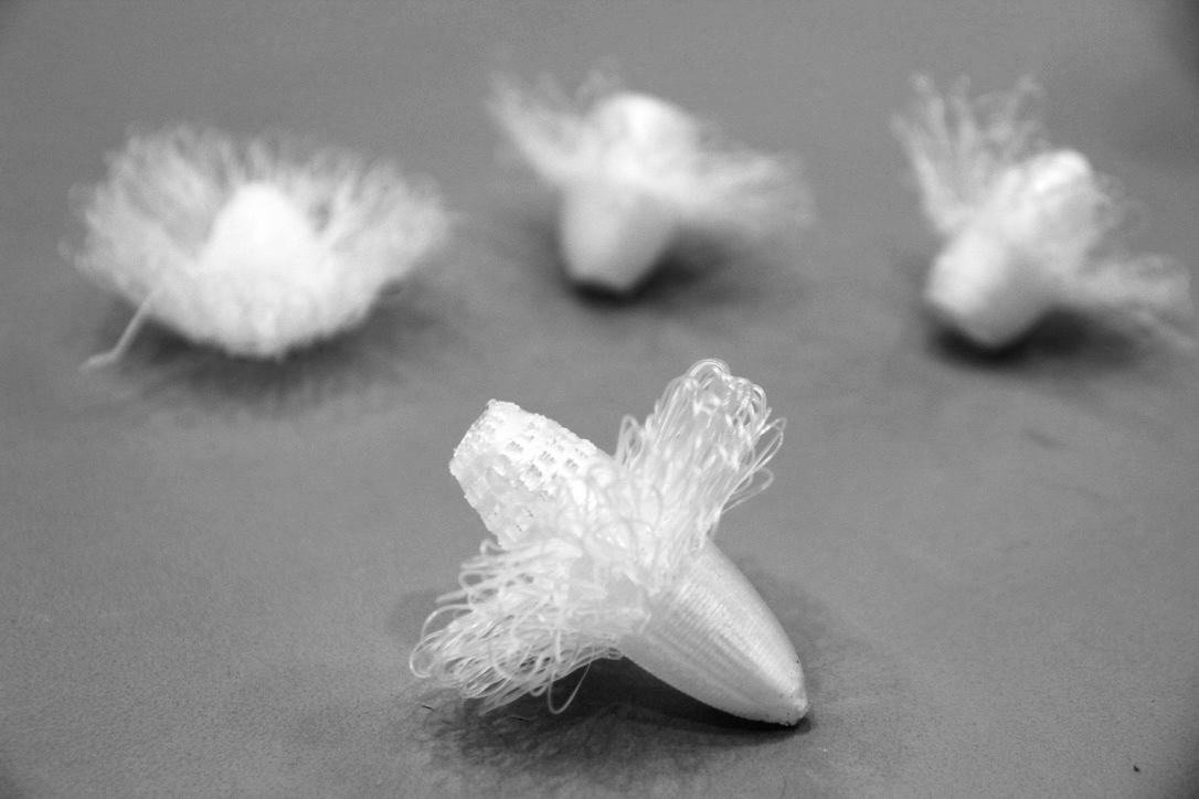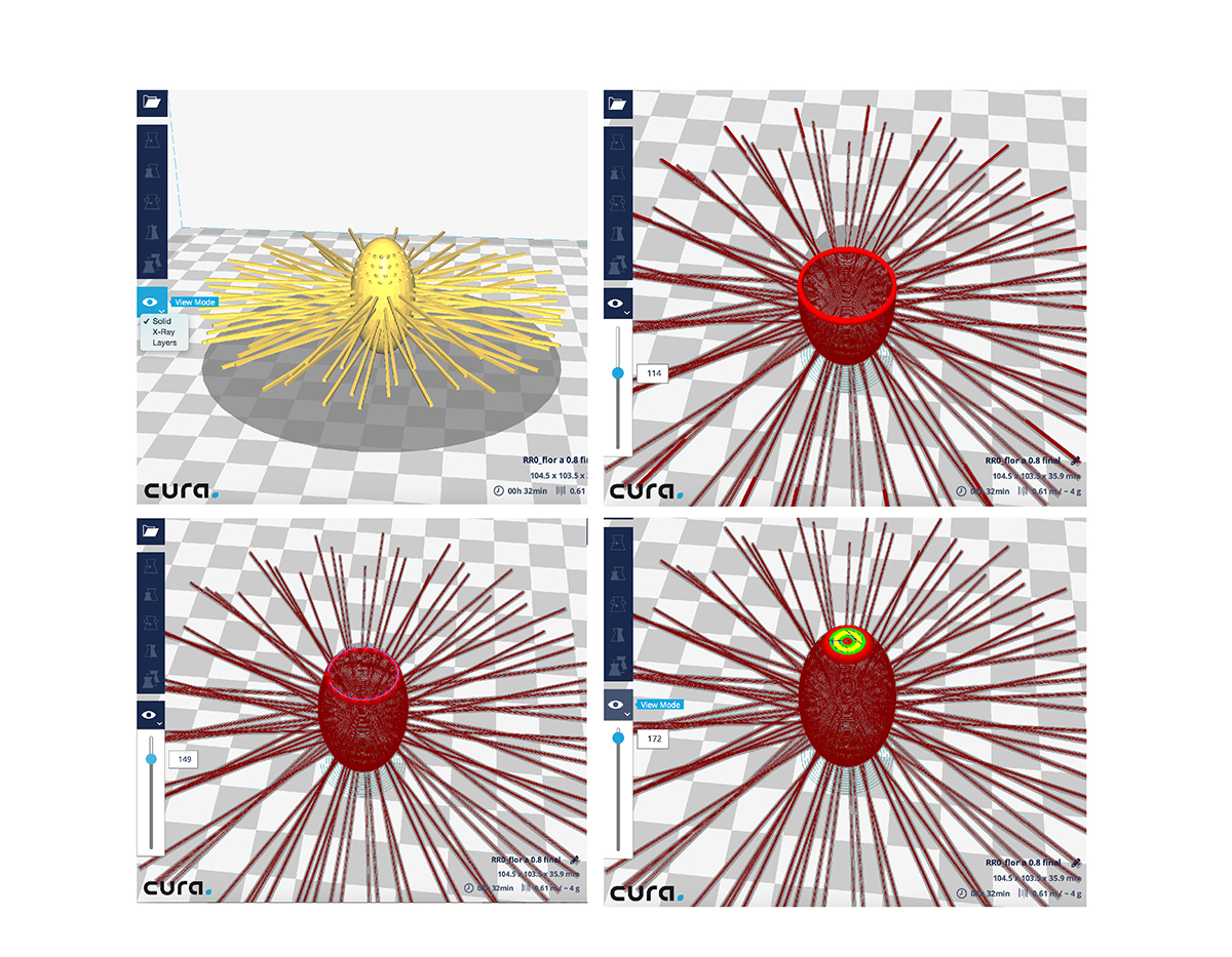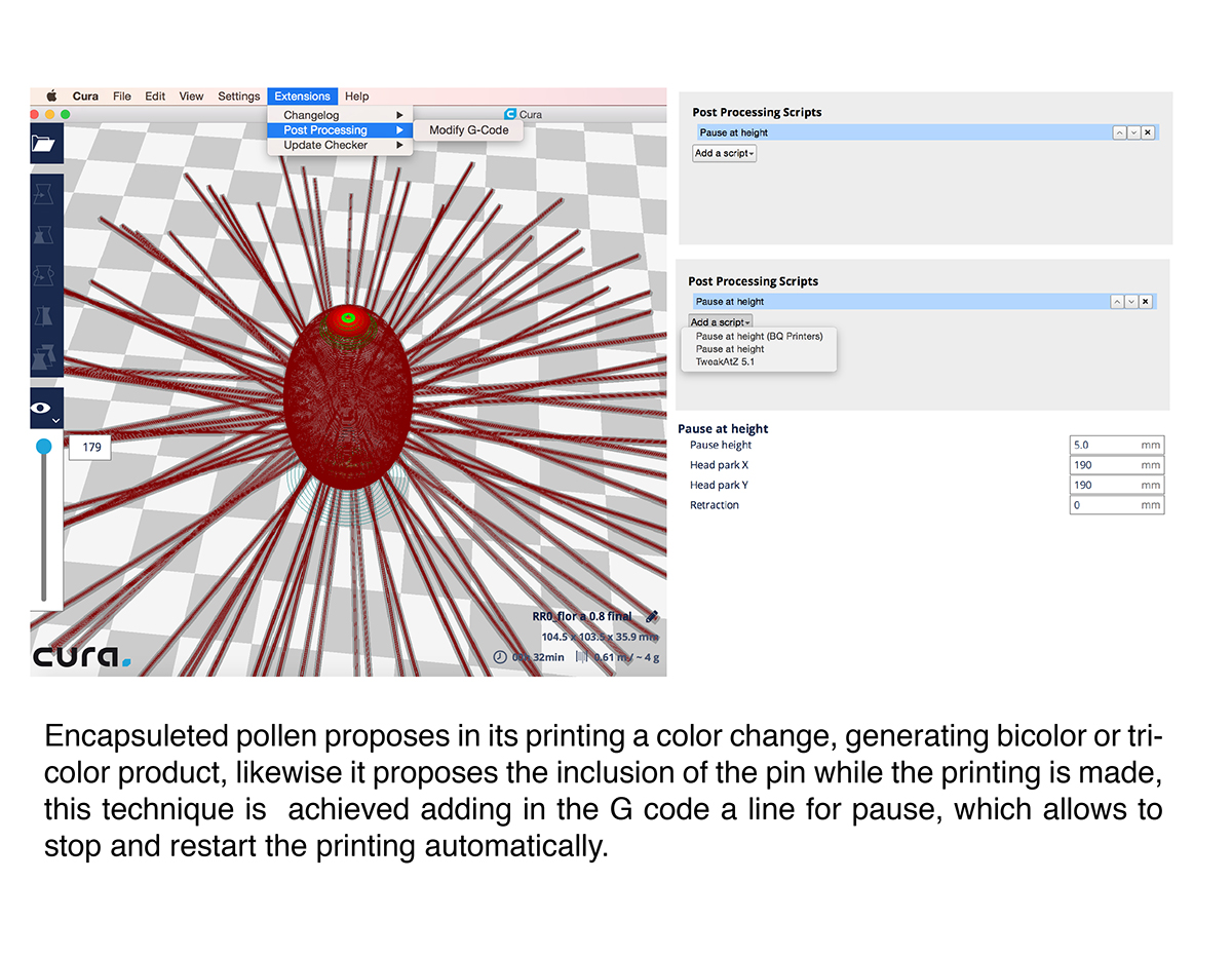 We use FDM 3D printing in order to make the leaves of the flower by extruding thin filament lines without support material. We pause the 3D print in specific height in order to introduce the hydrogel spheres and the metallic pin that stays encapsulated in the flower.