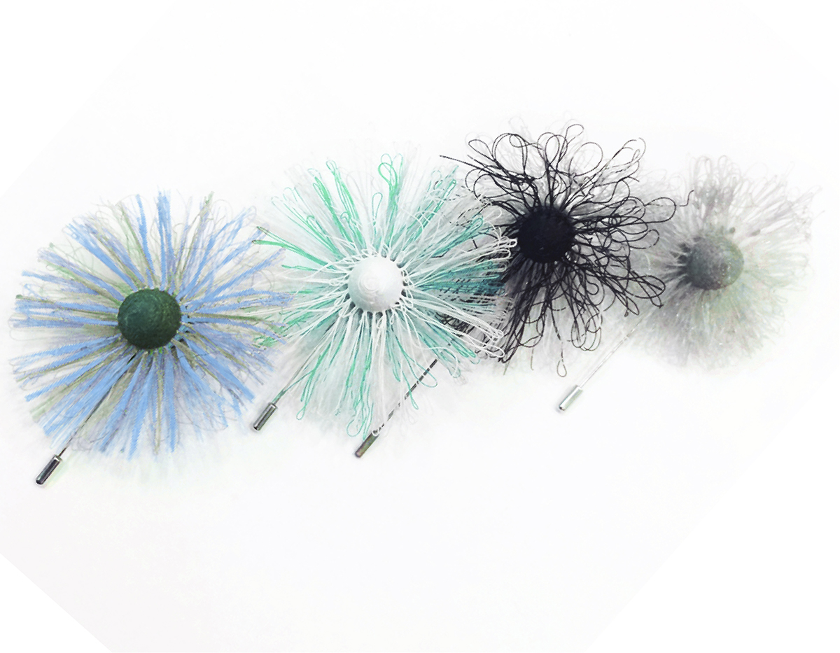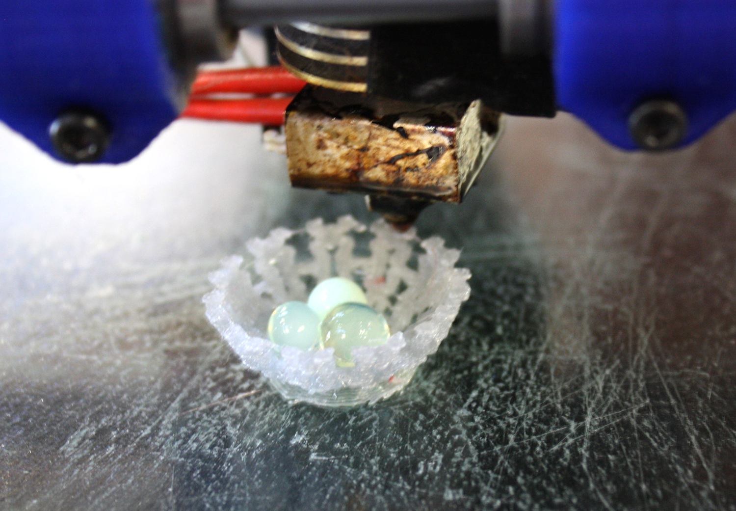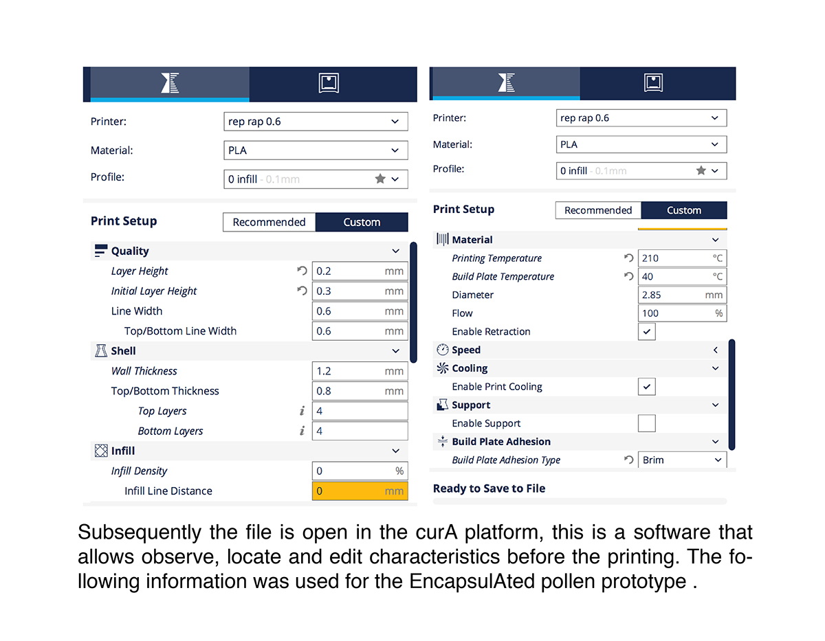 We use FDM 3D printing in order to make the leaves of the flower by extruding thin filament lines without support material. We pause the 3D print in specific height in order to introduce the hydrogel spheres and the metallic pin that stays encapsulated in the flower.