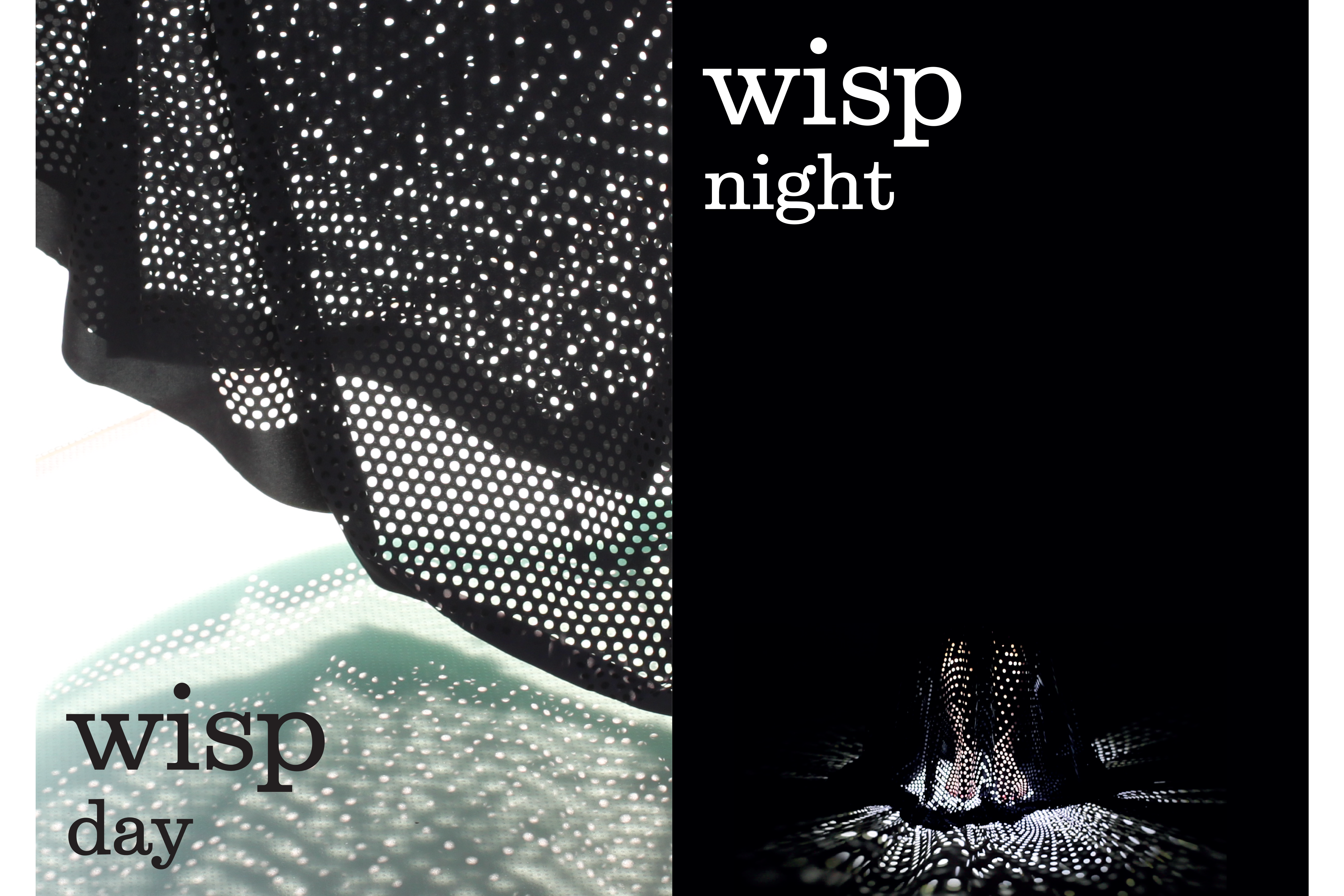 Wisp is traditionally defined as a floating ball of light. .The dress transforms at night. Light patterns are projected outward as its wearer turns into a beautiful and abstract light. At night, directional LEDs are worn on the legs generating an aura of organic geometry in permanent transformation alerting passerby’s of her presence as well as lighting the way through the dark. Light visualises and amplifies all movements transforming the space, creating confusion between light/shadow as well as fabric/space.