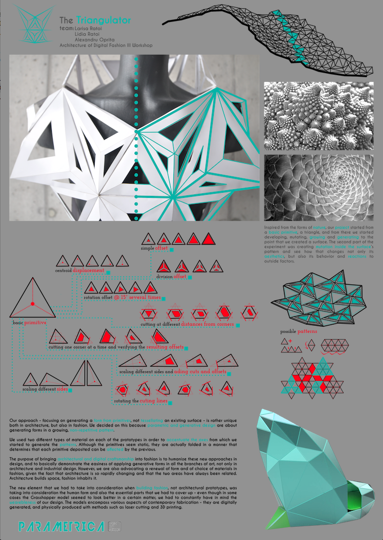 Diana Ditrenau leads together with young Romanian experts, designers, developers or architects, Parametrica, digi fab school. Experimental-workshops created by the school present projects like Exoskeleton Dress (designer Andrei Moldoveanu) and Hands Off Skirt (designer Diana Giurea) where architecture mixes with fashion and digital tools from other disciplines serve for fashion design.