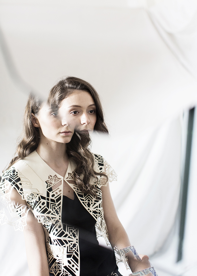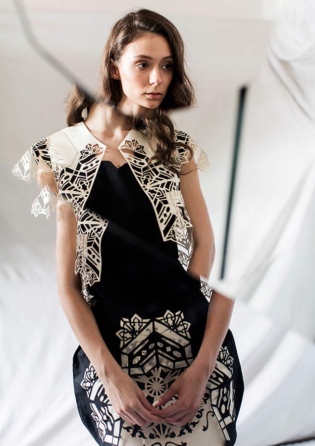 Cecilia during her residency - internship at Fab Lab Amsterdam has created a collection inspired by the complexity and beauty of the forms of nature . “Natural forms, patterns, surfaces and processes that create what surround us. But even more important, because we are talking about digital fabrication, the limits and the boundaries of each machine are really what guided my project, as they are different than the ones i normally encounter as fashion and textiles designer.” Cecilia's work opens a dialog of design thinking where material, laser cutting and pattern co exist, one setting the parameters for the other.
