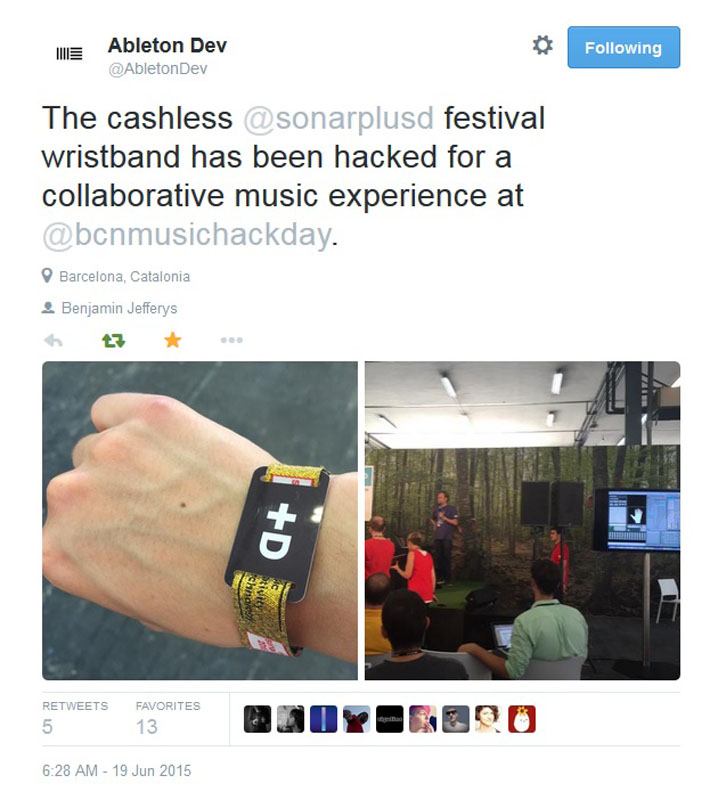 In 2015 Sonar introduces for the first time the NFC cashless payment system for everything that was sold inside the festival. Each person that atended the festival had one of this tags. IDSound is a critical engineering project that exploits this system and is using the identification data that is stored on these tags to generate a unique sound id for each attendee of the festival. Together with a “smart” glove this system is used for a participative music performance.