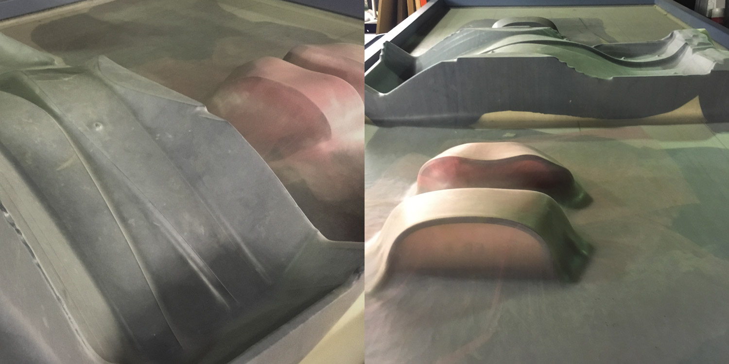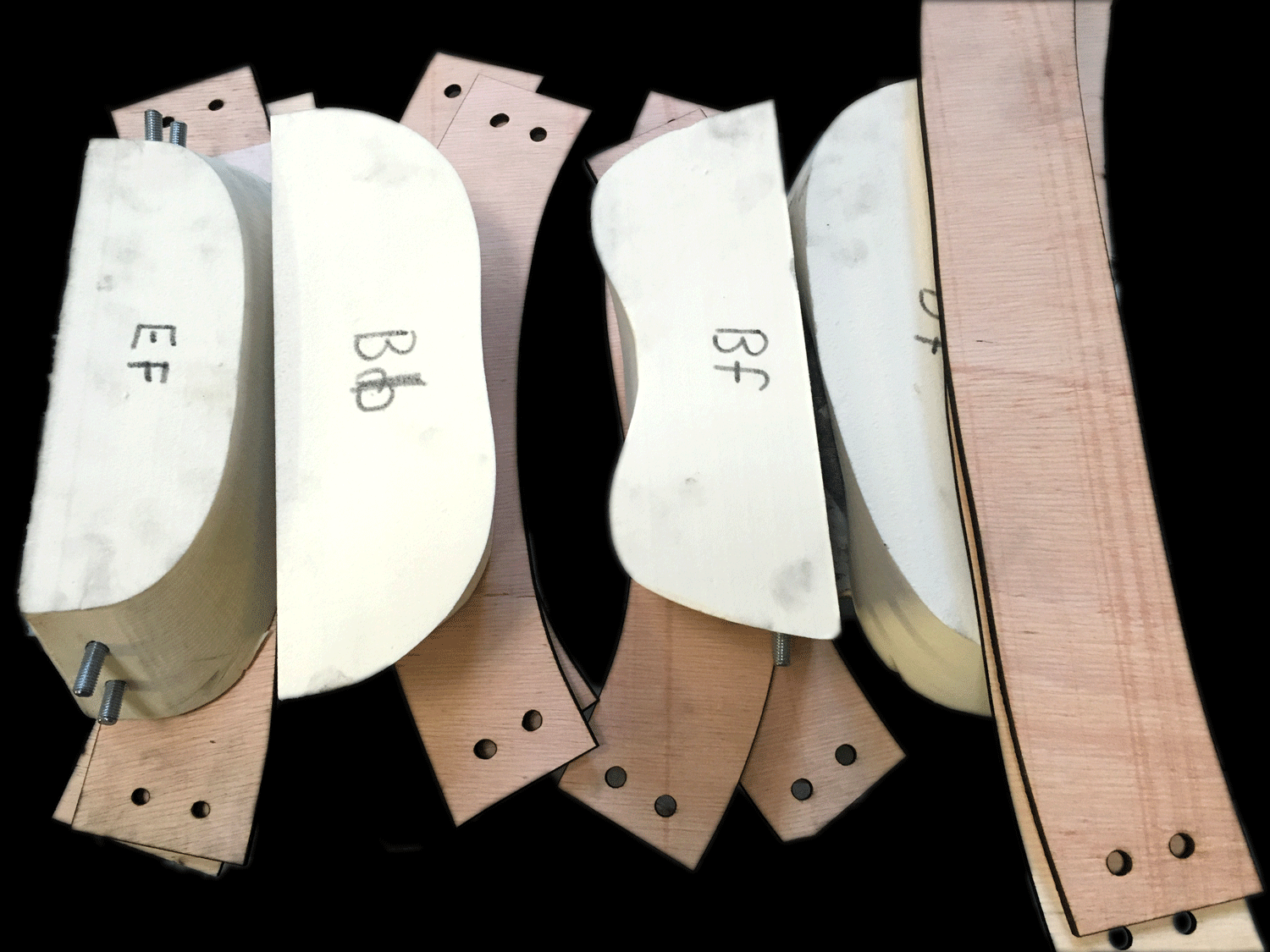 The composite is made of 3 layers of wooden stripes and 3 of textile alternating and glued with cascamite wood glue, layers over the CNC milled molds and vacuum pressed for 5hours. The final pieces are joined with screws.