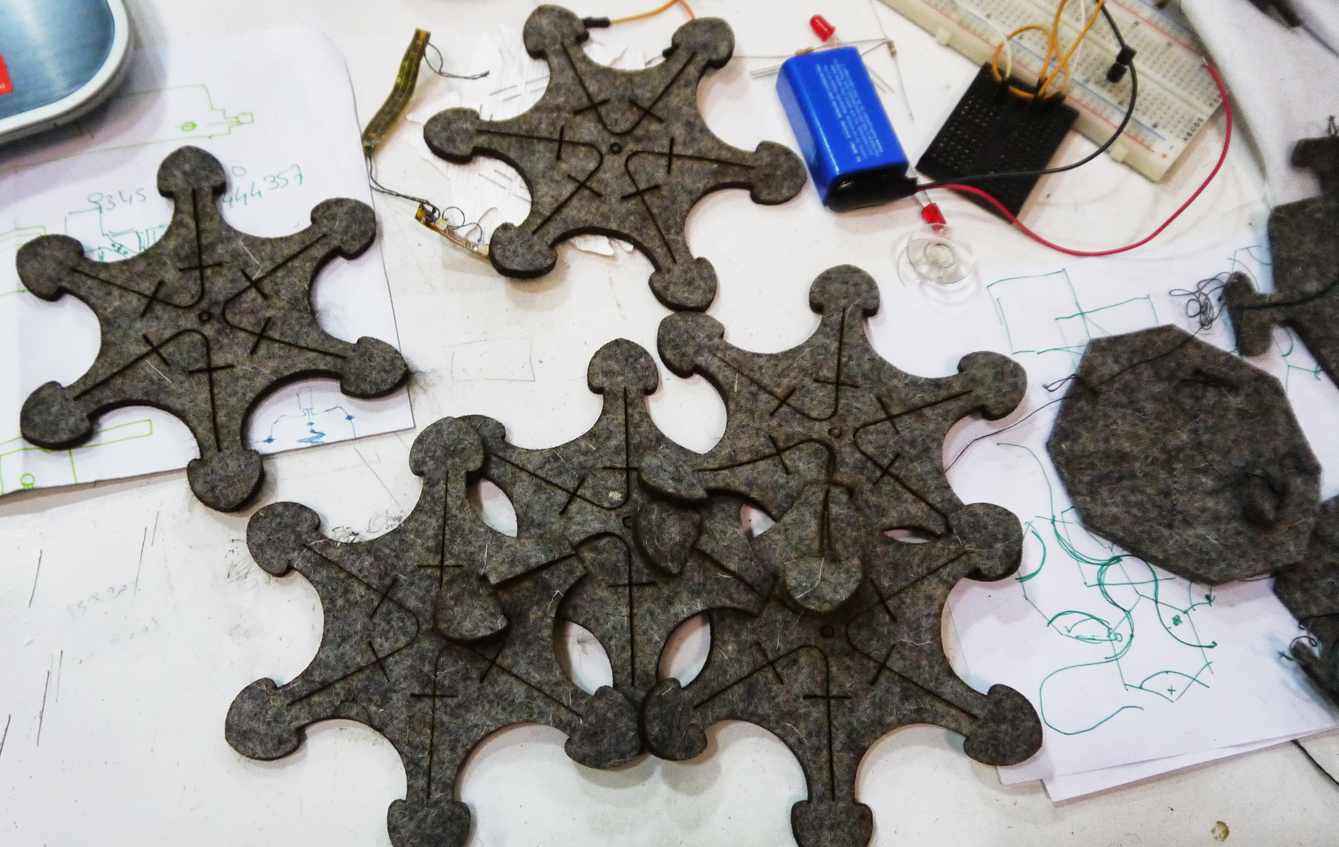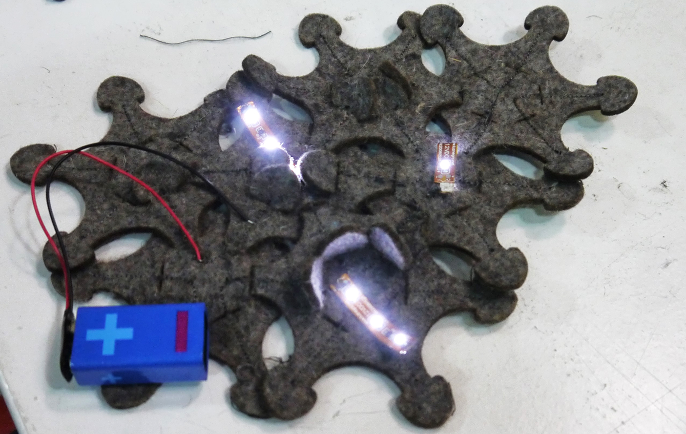 Además del sistema modular, también se desarrolló un sistema para el circuito cosido en el textil, para introducir iluminación LED en la prenda.