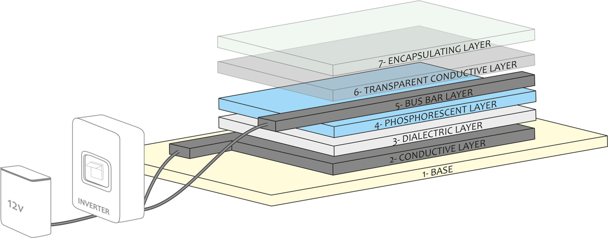 Electroluminescent Paint is essentially a painted circuit. A multi-layered system which uses an alternating current (A.C) power source in order to emit light.