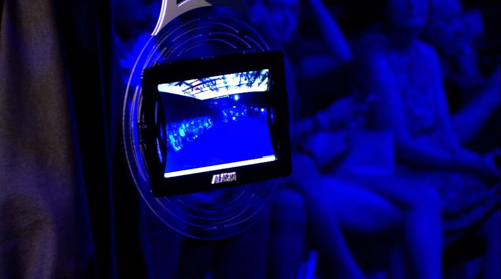 -Output: the filming of the runway of the model on the catwalk is displayed on the tablet device