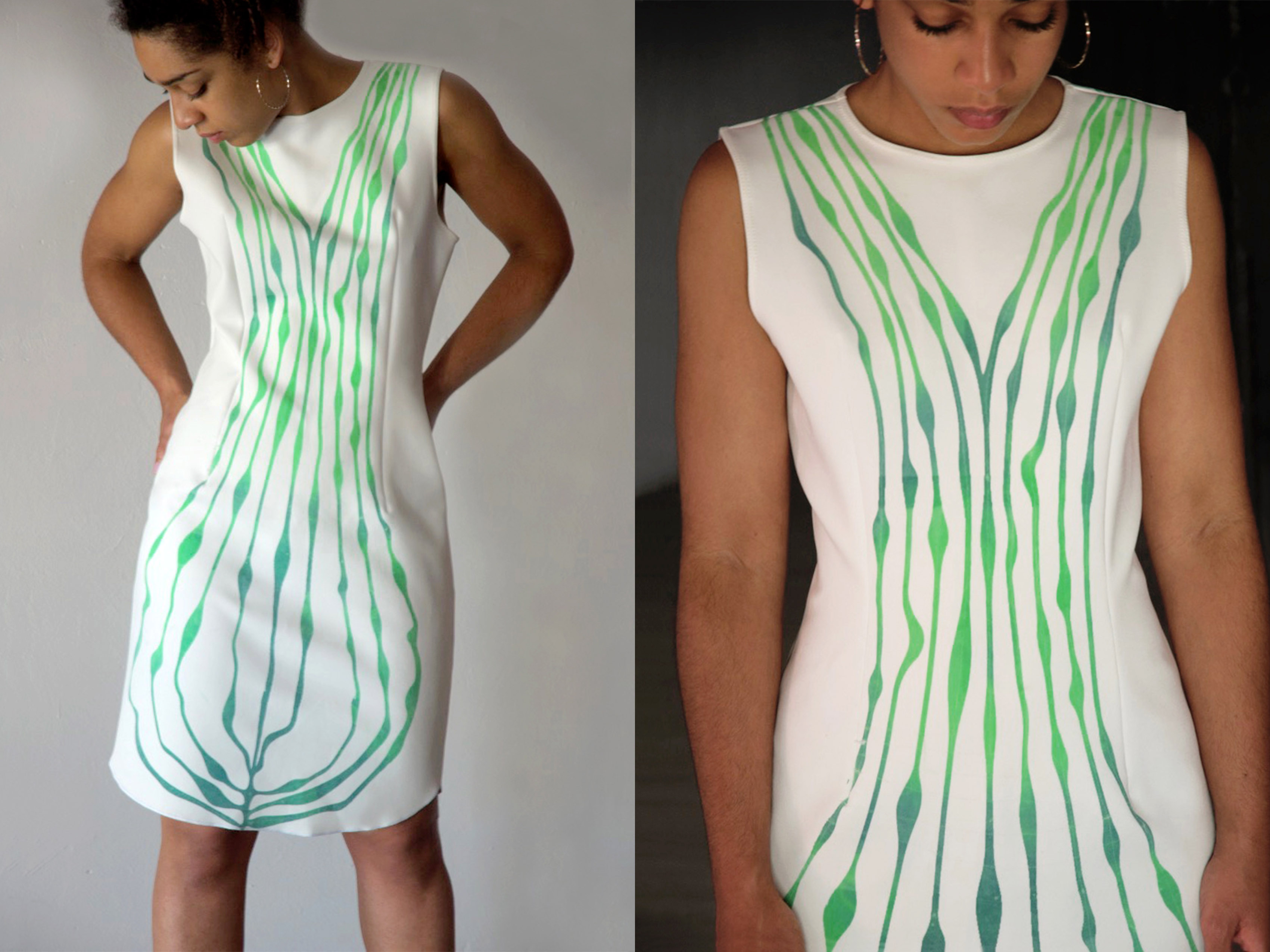 .Our Thermochromiconductive Top project made us realize that body heat was causing undesirable changes to the pattern. The thermochromic inks we were using were too sensitive, so we decided to remove the conductive threads and create a dress with thermochromic ink only.