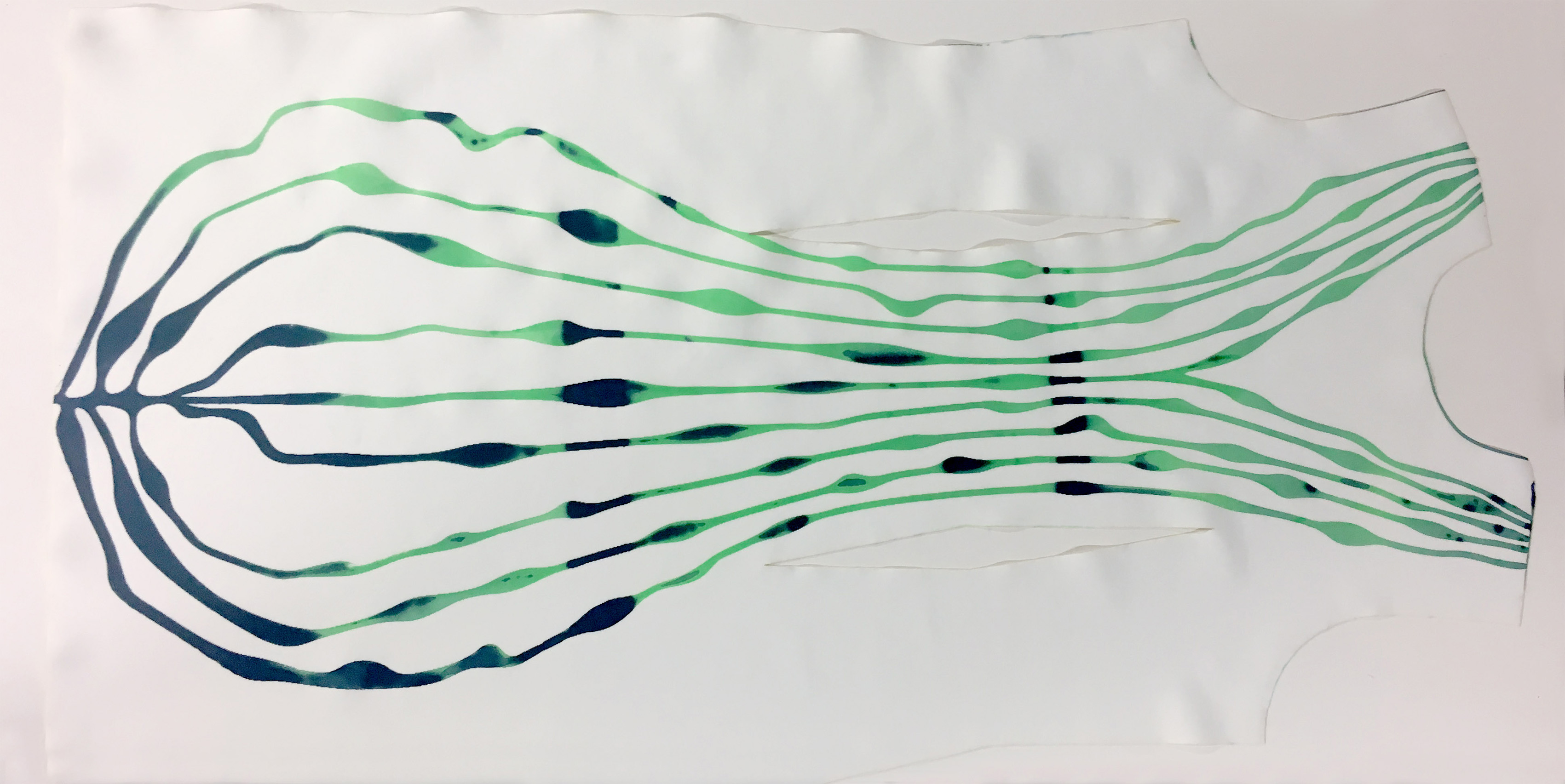 Anastasia designed a form-fitting dress with an organic pattern representing the body flow. The model of the dress was conceived on Illustrator and laser cut with the lab Trotec. The motif was screen-printed before assembling and sewing the pattern of the dress.