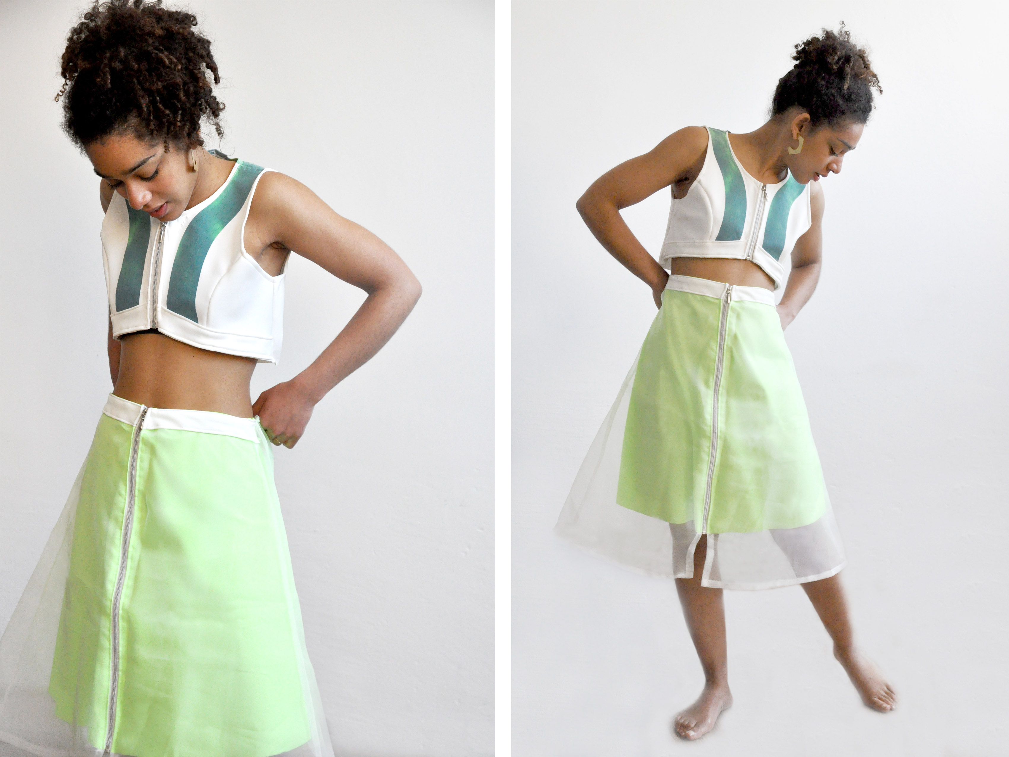 .At the end of this research, we decided to develop a Thermochromiconductive Top* that changes pattern according to conductive threads linked to an Arduino system. The Arduino is connected to a Bluetooth device (Adafruit M0 Feather) which allows one to control the pattern of the dress with a mobile phone. The code implemented in the Arduino produced several heating combinations, such that lines appears in the thermochromic paint, gradually changing the shape of the pattern.